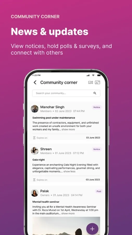 - Send email and app notifications to all the association members and the residents living in the gated community.