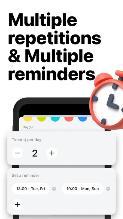 • Strategic Scheduling: Set up habits for the days that work best for you, making time management and discipline a breeze.