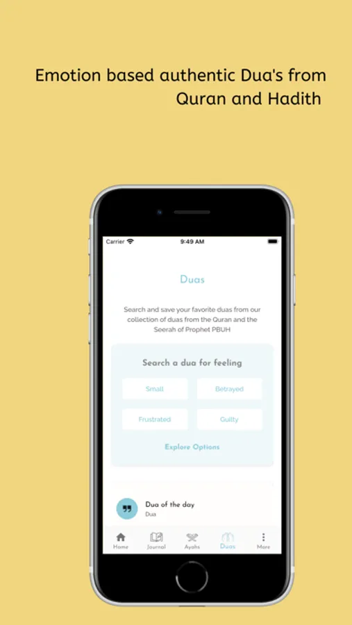 - Action recommendations for each emotion in the form of Dua from Quran and Hadith, Azkar, names of Allah and relevant hadith to read