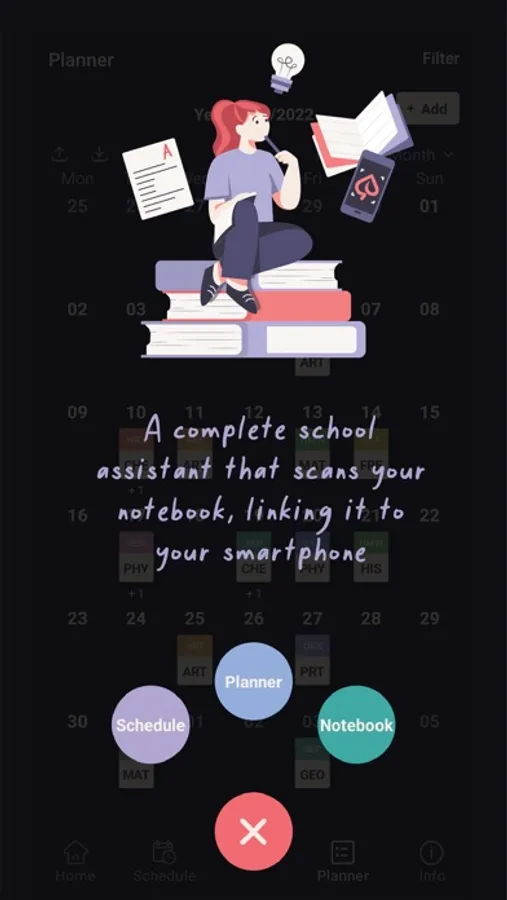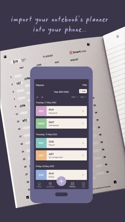 The app reads the 3-letter codes on your notebook's planner, importing all new tasks into your smartphone. It also sends you timely notifications to study for exams, do your homework and much more.