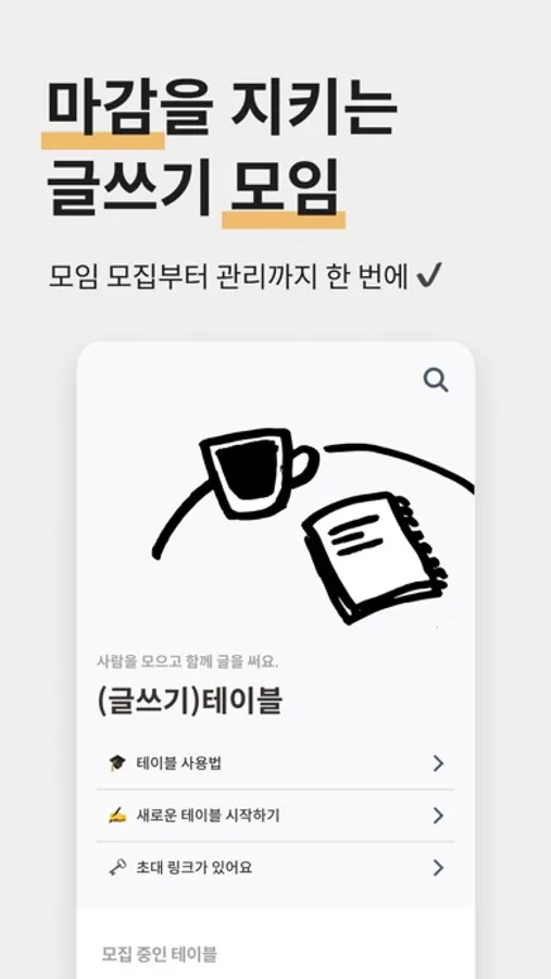 다른 사람의 글이 곧 나의 글쓰기 자극제입니다. 사람을 모으고, 함께 글을 쓰고, 마감을 지켜요. 글쓴이들과 영차영차 완주를 향해 달려가요. 니체님, 박완서님, 공드리님… 필명은 은는이가가 지어드려요. 익명 공간에서 자유롭게 생각을 나눠 보세요.