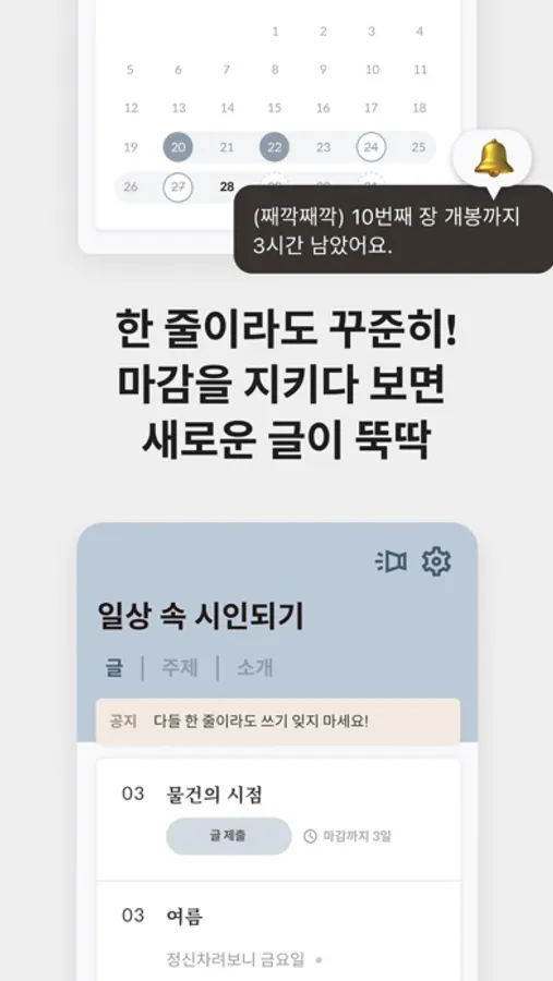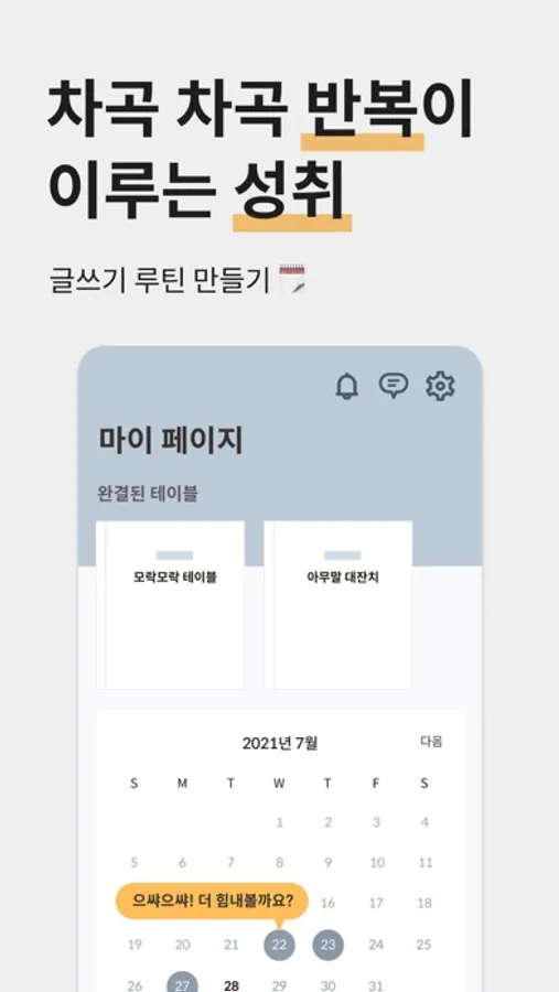 글쓰기가 아직 어색한가요? 하루에 한 줄씩, 작심 5일 동안 일기를 써봐도 좋아요. 차곡차곡 은는이가에서 목표를 달성하세요. 몇 날 며칠 어떤 감정을 느꼈는지 언제든 돌아볼 수 있어요. 꾸준히 채워진 달력과 함께!