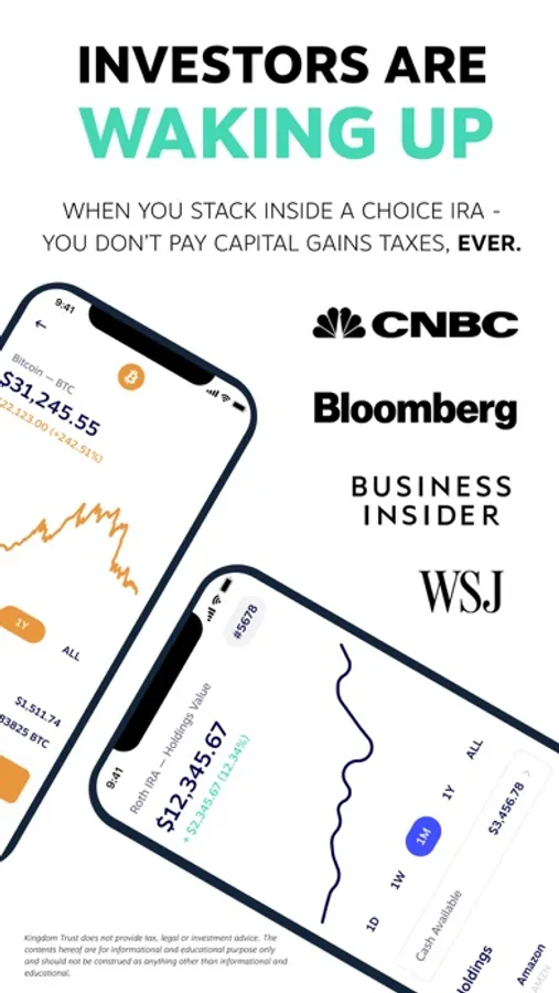 When you open a Choice Account, you are opening an Individual Retirement Account -- an IRA for short. Investing in an IRA means you pay NO CAPITAL GAINS TAXES. You read that right, while you are building your bitcoin stack or trading stocks and other crypto from a Choice IRA - you don't pay any capital gains on your trades or investment returns.