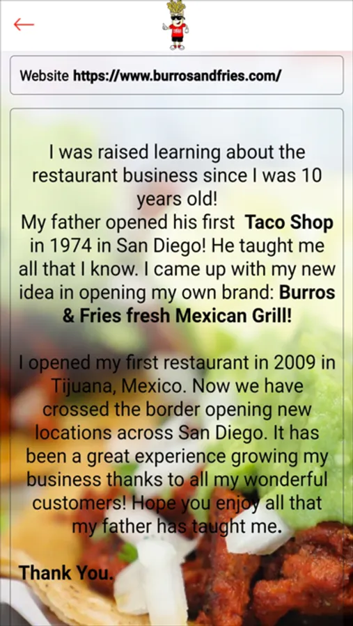 I was raised learning about the restaurant business since I was 10 years old! My father opened his first Taco Shop in 1974 in San Diego! He taught me all that I know. I came up with my new idea in opening my own brand: Burros & Fries fresh Mexican grill! I opened my first restaurant in 2009 in Tijuana, Mexico.