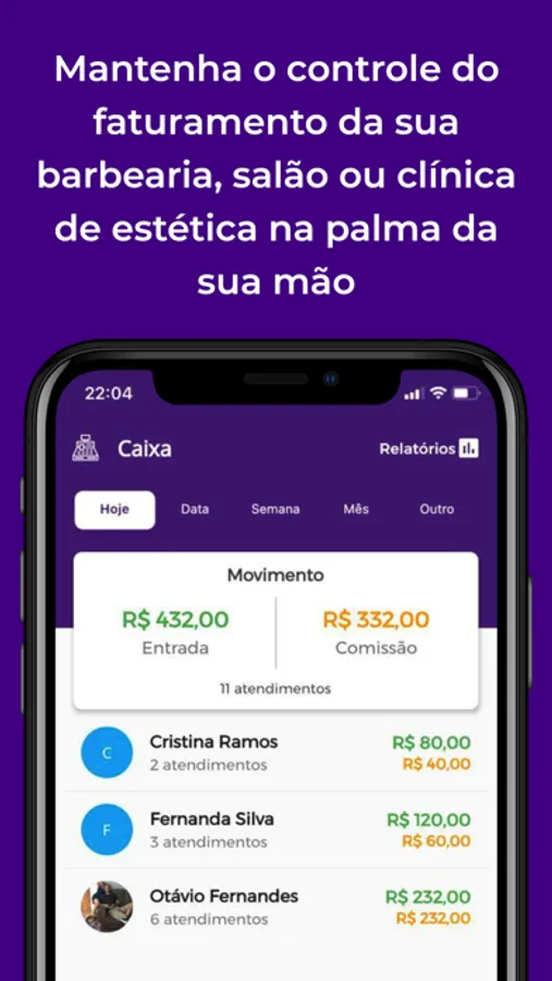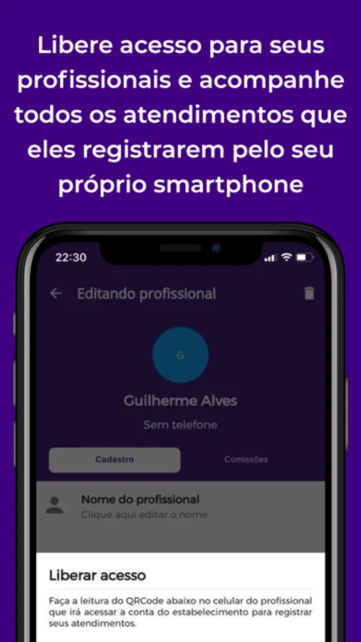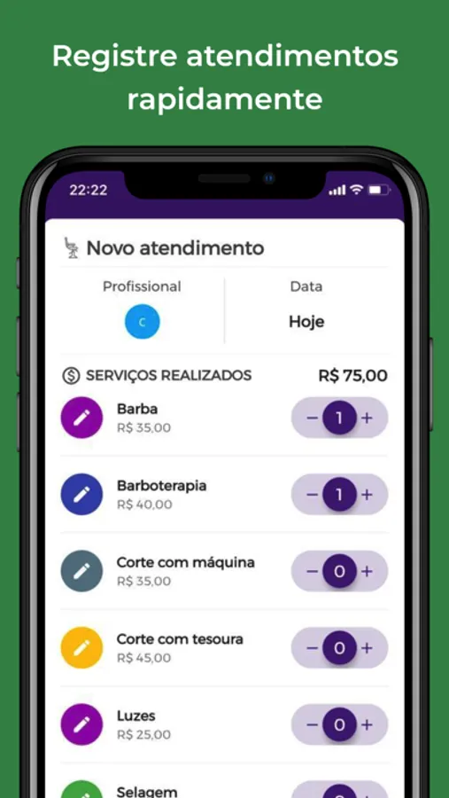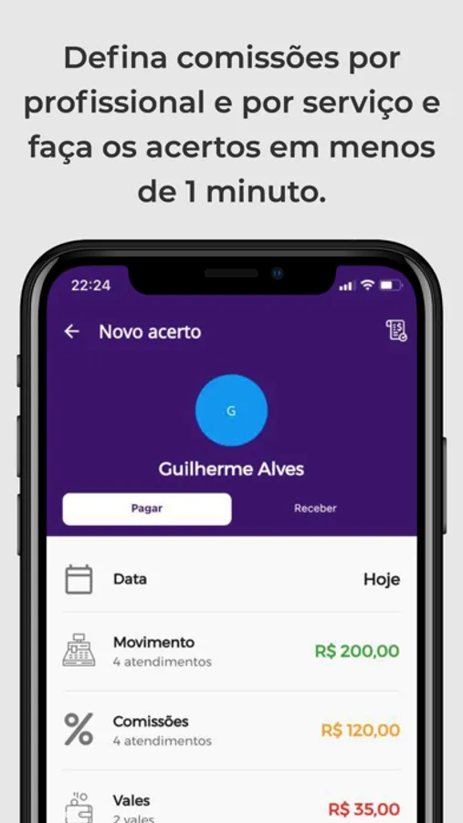 Registre seu estabelecimento. Cadastre profissionais, serviços e defina comissões. Seus profissionais registram os atendimentos em seus próprios smartphones. O cálculo dos acertos é feito no aplicativo sem trabalho e sem dor de cabeça em no máximo 2 minutos.