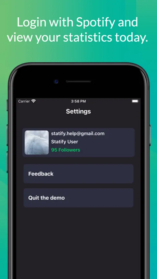 Statify allows you gain insight into your Spotify account's music listening history. This is achieved by logging into your Spotify account through Statify. After logging in you'll be able to do the following