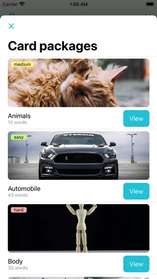 Card packages allow you to learn the exact topics that are of interest to you now: animals, food, automobile, body, house, etc.