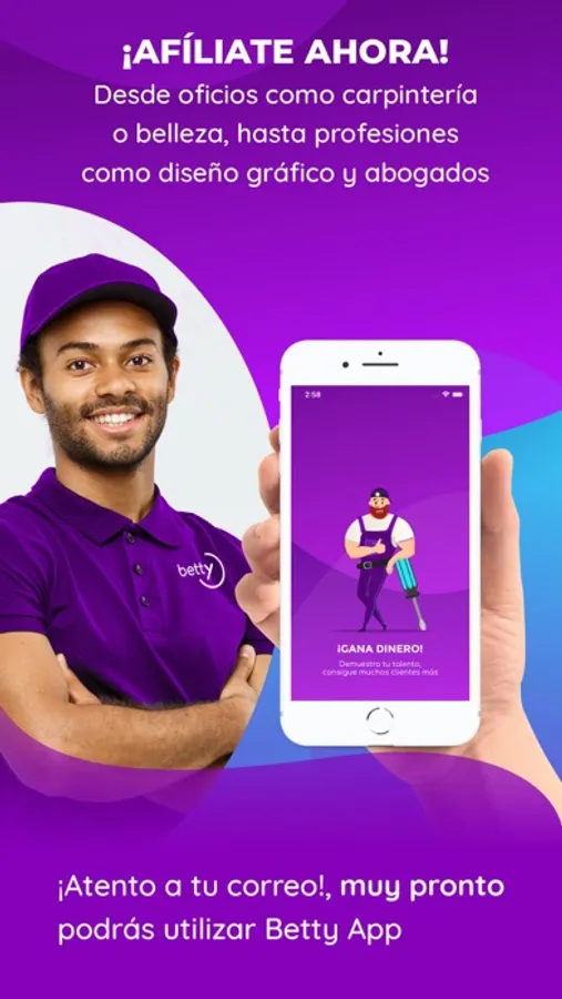 Con Betty Afiliados podrás aplicar como un afiliado profesional o empresa para poder ofrecer tus servicios profesionales a domicilio o de forma virtual a través de nuestra aplicación Betty App.