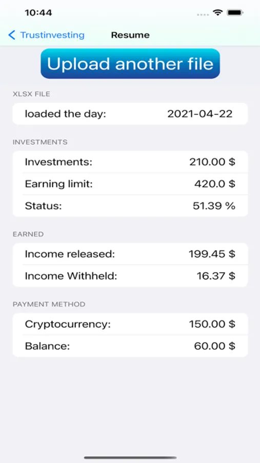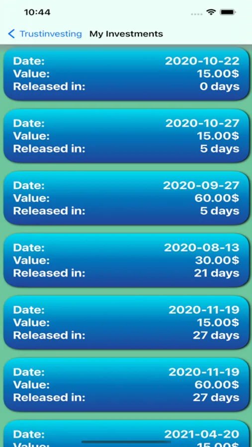 Allows you to see a global summary of the status of your assets at that moment, how many days are left for each asset to release the balance in real time without enter the Trustinvesting website.