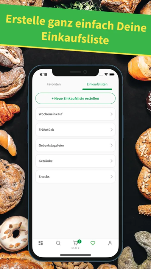 - Jederzeit mehrere Einkaufslisten erstellen und kaufen möglich