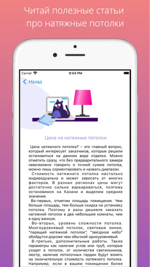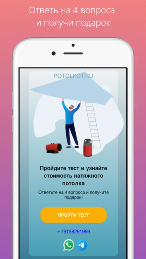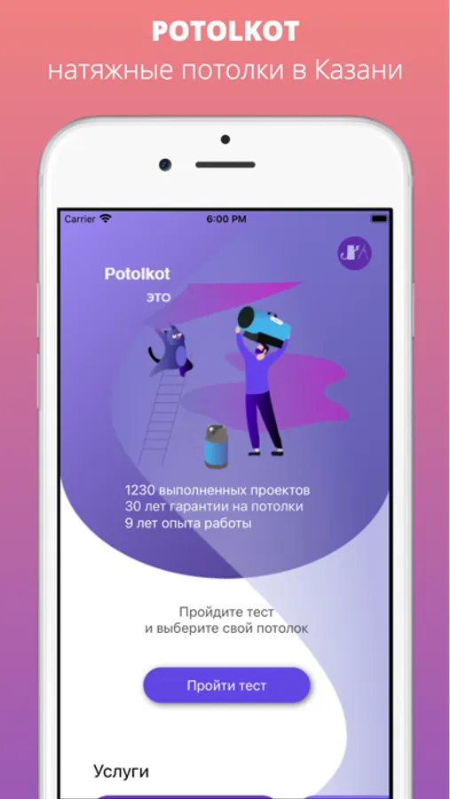 Potolkot - удобное приложение о натяжных потолках, в котором можно читать полезные статьи, рассчитать примерную стоимость, пройти легкий тест и получить подарок, а также бесплатно заказать замер натяжного потолка.
