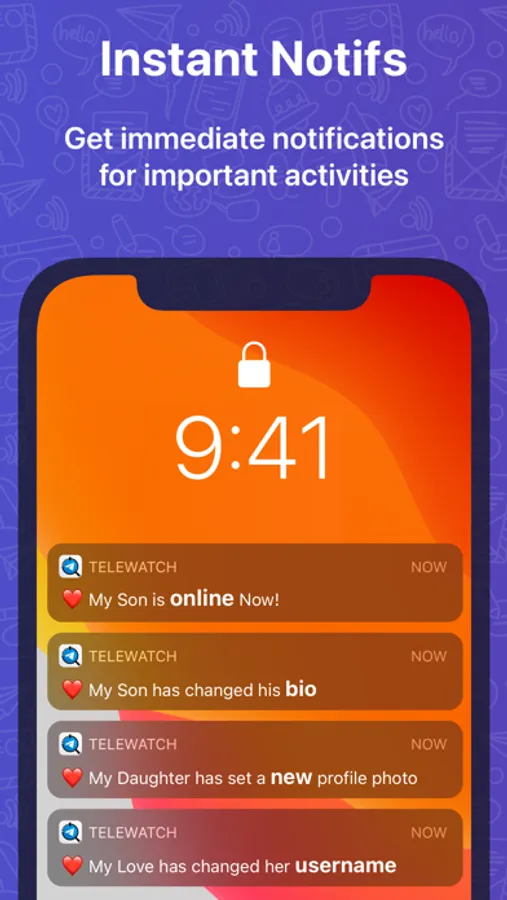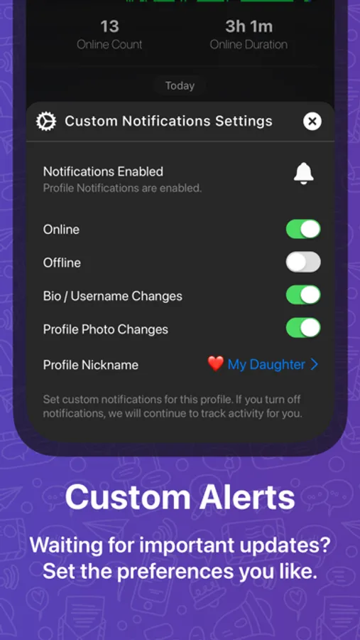 TeleWatch allows you to get notified about changes on your child’s profiles. Our notifications are customizable, and you can set the notification settings to receive online/offline status and profile changes, and set the time to give notifications.