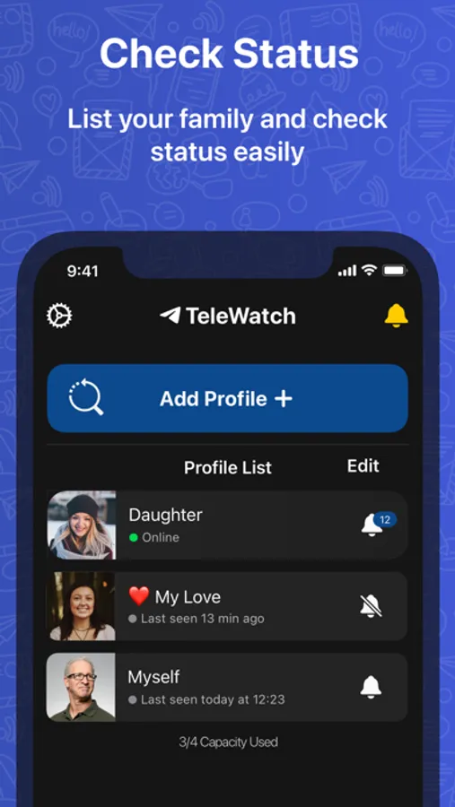 • TeleWatch app complies with Telegram privacy policy and terms of use and provides status in Telegram messenger only