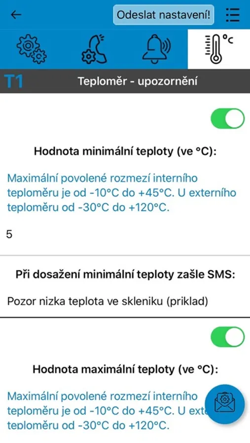 • Nastavení hraničních hodnot poklesu/překročení teploty u interního nebo externího teploměru