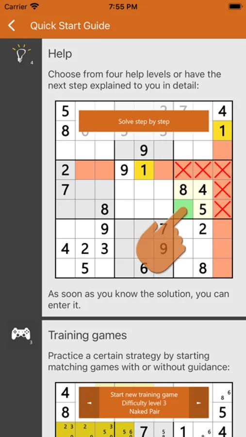 The operation of Sudoku Logica Lite is very simple and it is suitable for beginners as well as for advanced because of the four help levels, the five difficulty levels, the logical explaining help and the 14 strategies of the training games.