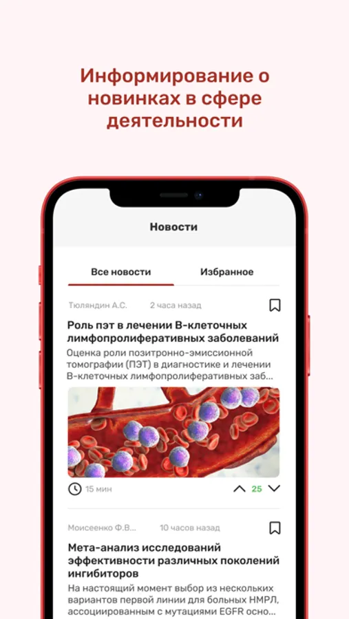 Новостная лента реализуется отдельным блоком приложения и будет разделена по принципу значимости апдейтов новостной информации: наиболее важные события в мире онкологии будут публиковаться в режиме PUSH, помимо этого отдельный дайджест будет вестись в режиме новостной ленты с возможностью пометки избранного.