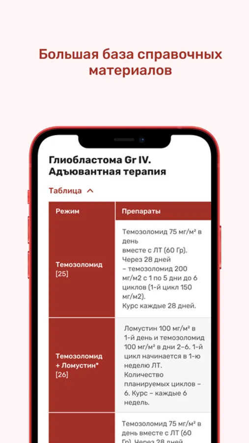 За основу функционала взято электронное Национальное руководство (НР) по лекарственному лечению злокачественных опухолей под редакцией академика РАН А. Д. Каприна: цифровая версия представляет собой логический навигатор по нозологиям с подразделами, включающими в себя молекулярногенетические и иммуногистохимические исследования, необходимый перечень противоопухолевых маркеров и специфических исследований для принятия решения о выборе того или иного режима лекарственного лечения. Приведены детальные схемы нео-адъювантной, периоперационной лекарственной и химиолучевой терапии, для первой, второй и последующих линий с показателями непосредственной эффективности и отдаленными результатами. В справочник уже включены режимы терапии и лекарственные препараты, одобренные FDA и EMA, но пока еще не зарегистрированные на территории РФ, с данными по эффективности и переносимости лечения – чтобы пользователи Med Onc были информированы о последних достижениях и понимали вектор развития мирового лекарственного арсенала. Электронные ссылки будут оцифрованы для удобства обращения к первоисточникам данных.