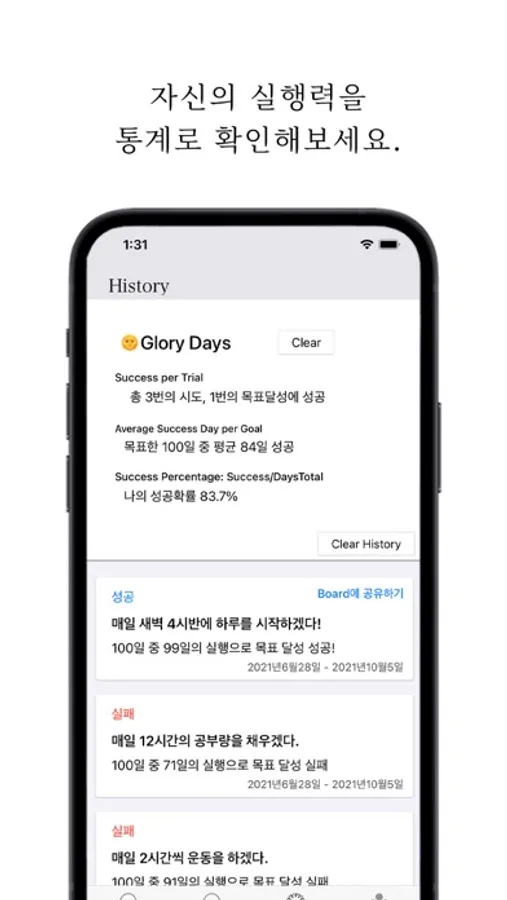 # 자신의 목표 달성 성공률 등의 통계를 확인할 수 있습니다.