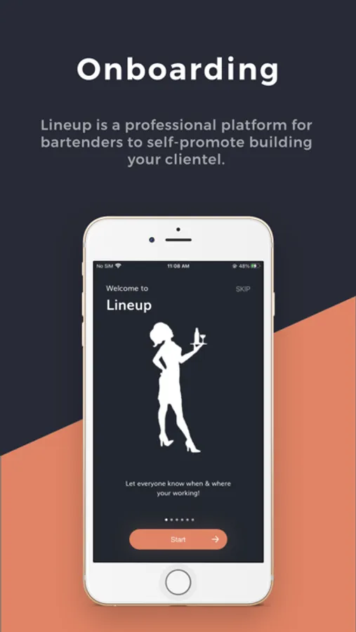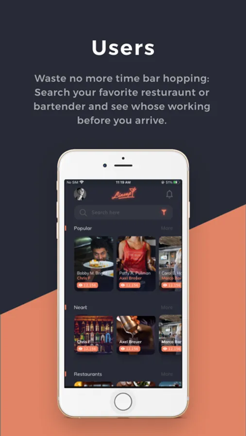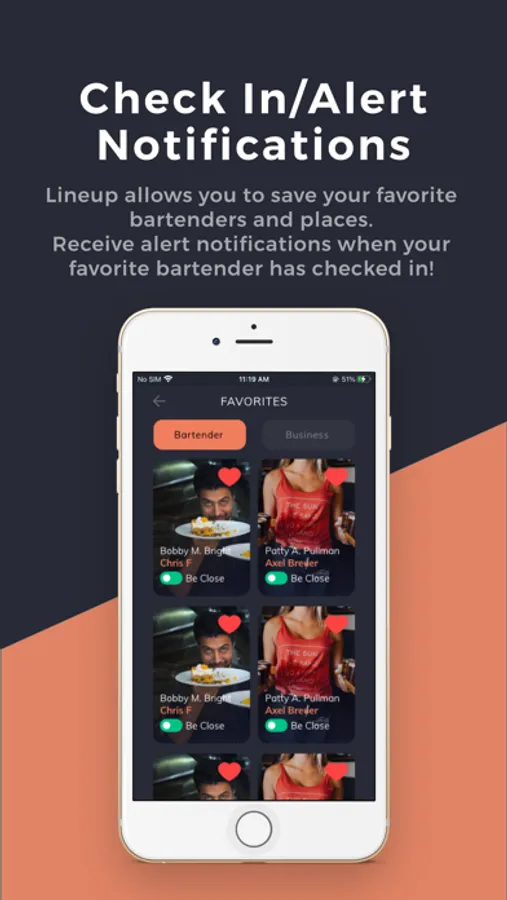 Lineup is a mobile app that would help people to track their preferred bartenders and know where they are checked in/out. The app supports three types of accounts: