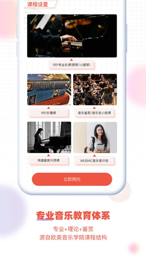 MUSIAC慕乐课目前开设钢琴,小提琴和音乐理论专业课程。MUSIAC 慕乐课提供从业余兴趣,专业艺考和国际音乐学院申请的多样化音乐课程,全英文或中文授课。MUSIAC 音乐留学咨询专注欧美音乐学院留学申请,通过平台签约演奏家师资和专业顾问为学员获得梦校 Offer。