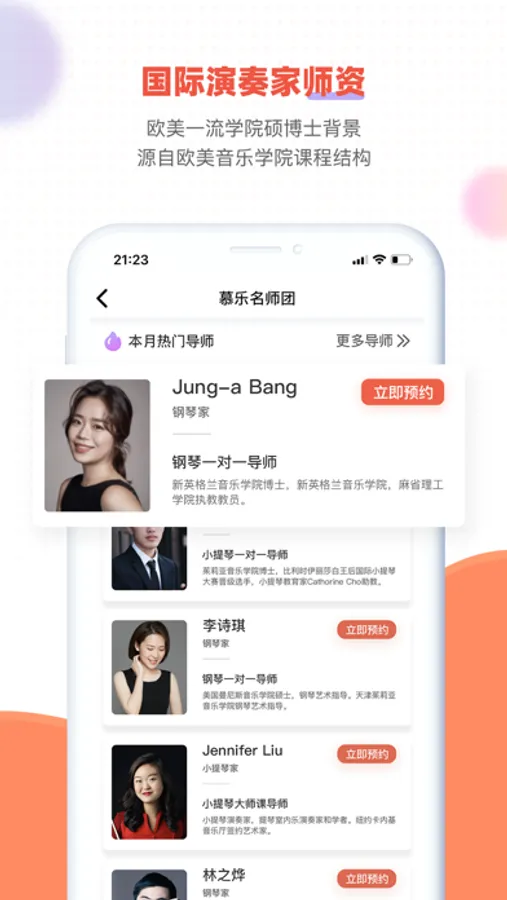 MUSIAC 慕乐课签约拥有欧美知名音乐学院硕博士学位的活跃演奏家组成导师团队,提供高端定制音乐1对1线上课程。