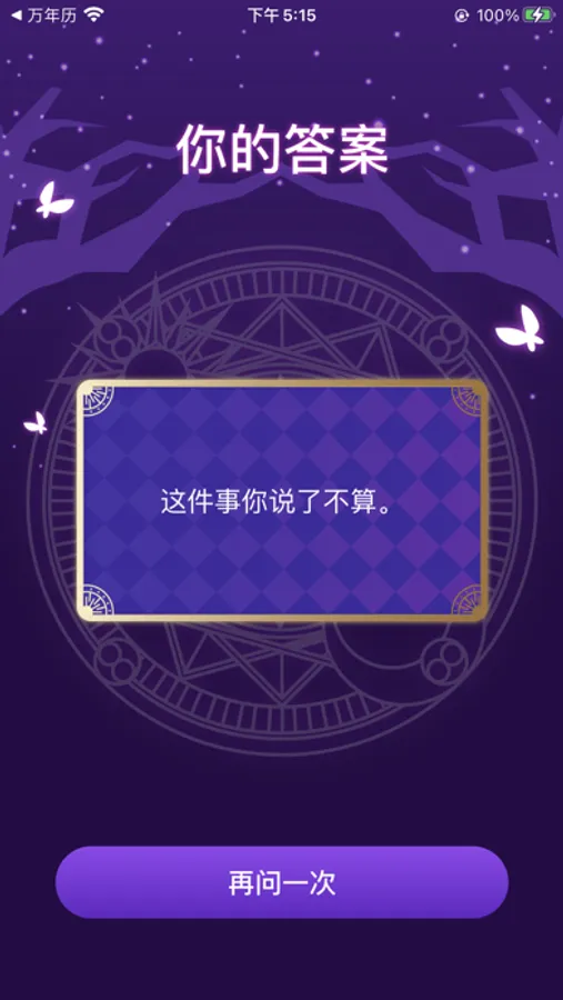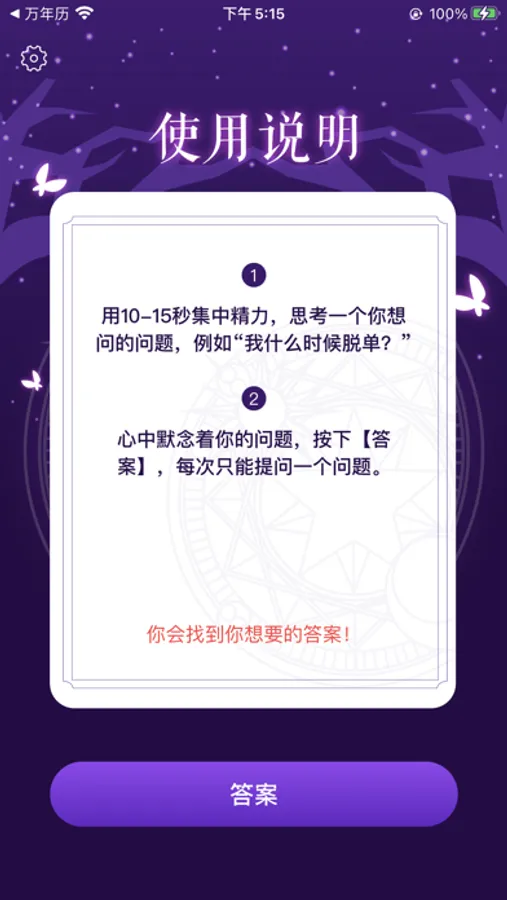 先想一个最近你特别纠结的问题,然后拿着手机专注10秒,再自然地点击获取答案按钮,你会得到一个心理暗示!