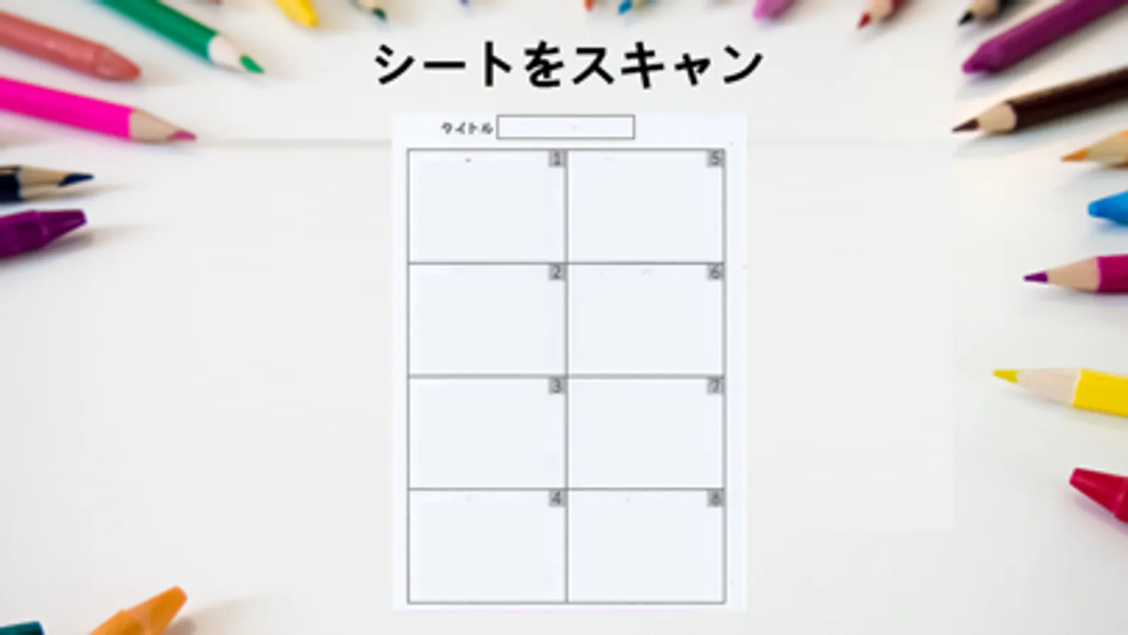 印刷した用紙に好みの絵を描いたり塗ったりして8コマのアニメーションを作成してください。