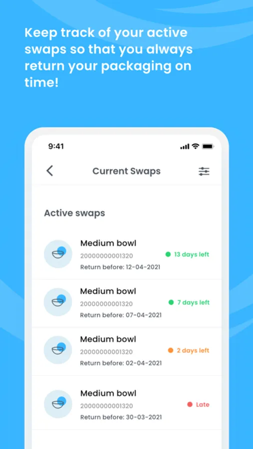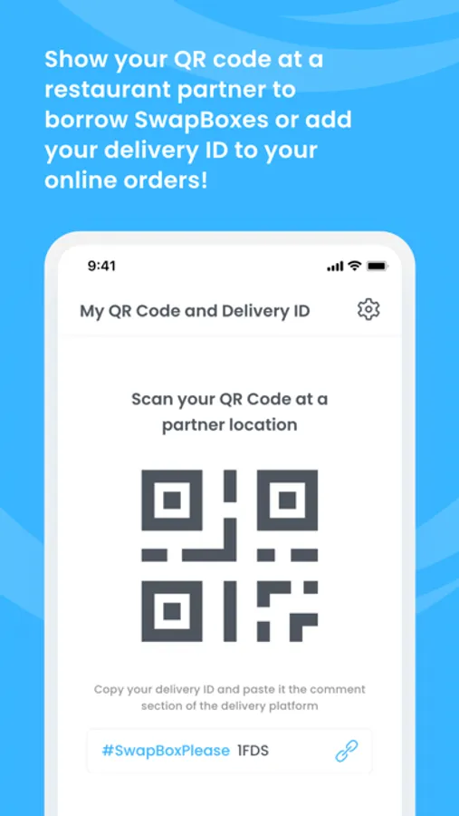 In the app, you will find your personal QR Code which restaurants will need to scan to provide you with our reusable packaging. Add your QR Code to your Apple Wallet to access your QR code even faster when visiting a restaurant partner. Once borrowed you can find the items on your account and see when you will need to return them. Using the locator in the app you can easily find the closest partner to drop off your SwapBox packaging. On your profile page you are able to track your impact and see how many swaps you have made.