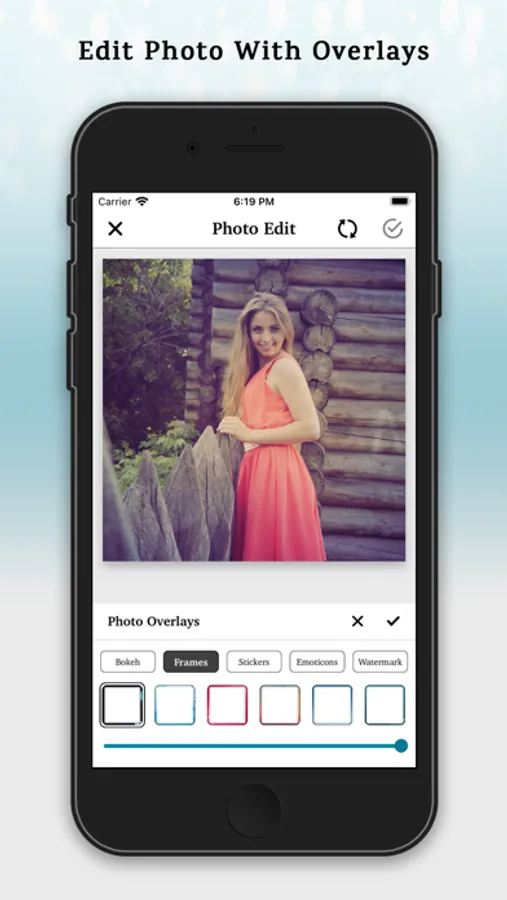 - Add text over photos and overlays like bokeh, frames, stickers, emoticons and watermark