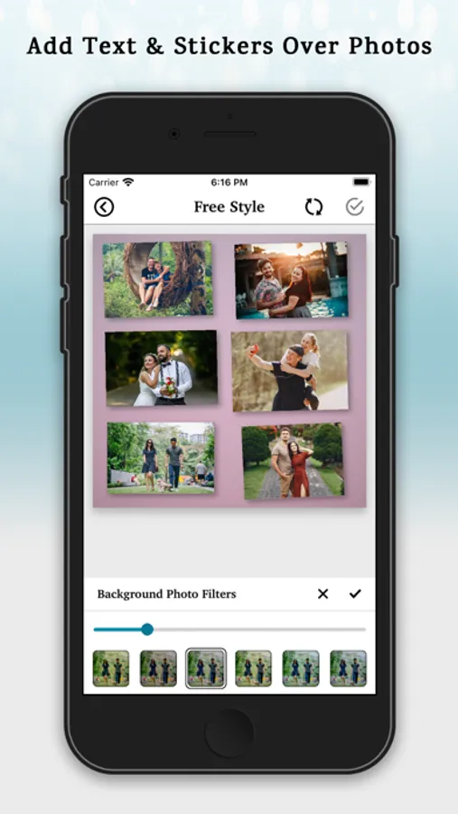 In Freestyle Collage photo will be added as sticker on canvas, so you can adjust photo size, layout of photo, set background for canvas, adjust border color and shadow color with intensity, add text and stickers over collage.
