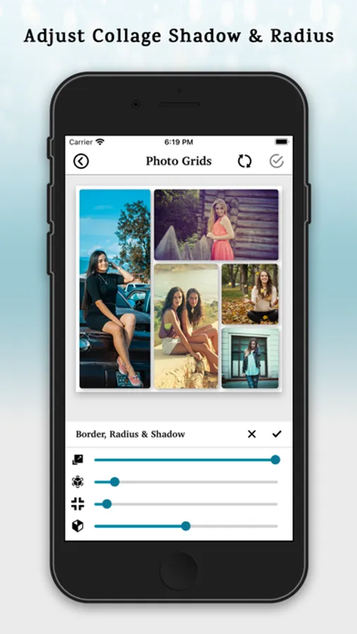In Grid style Collage app provides grids layout with different number photos, so you can choose grid layout for photos, add photo filters and color filters, adjust border color and shadow color with intensity, add text and stickers over collage.