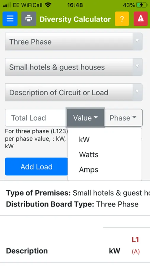 Enter your load values in Amps, Watts or kW, for three phase also select the phase for which the load applies to: L1, L2, L3 or L123.