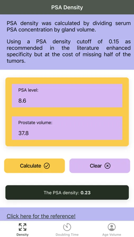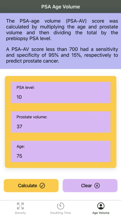 Disclaimer: all calculations must be re-checked and should not be used alone to guide patient care, nor should they substitute for clinical judgment. Calculations in this “Urology PSA Calculator - Prostate Cancer Evaluation” app might be different with your local practice. Consult to expert doctor whenever necessary.