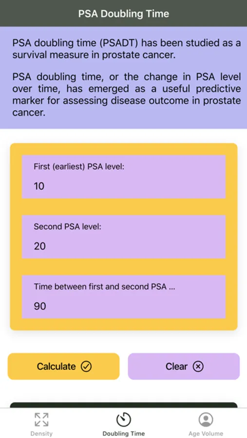 PSA doubling time (PSADT) has been studied as a survival measure in prostate cancer. PSA doubling time, or the change in PSA level over time, has emerged as a useful predictive marker for assessing disease outcome in prostate cancer. PSA doubling time can be an indicator of biochemical and clinical progression of prostate cancer. This "Urology PSA Calculator - Prostate Cancer Evaluation" app predicts the changes in PSA levels over time.