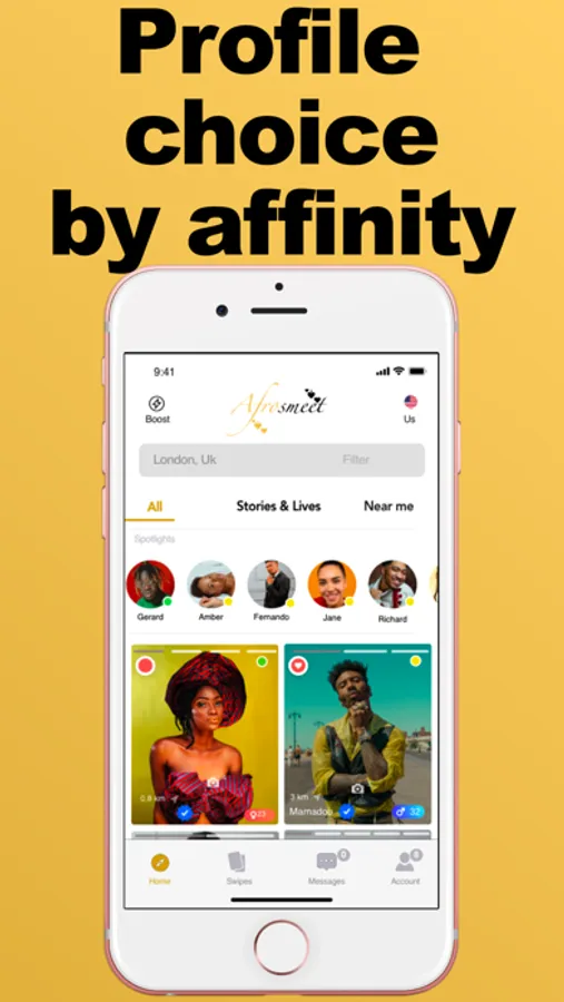 Afrosmeet is a dating app dedicated to the Afro community worldwide, which offers you the possibility to discover people sharing the same culture, interests and much more within a fun, secure and innovative interface. You can choose from 7 languages, swipe, chat, post stories and find people you've met in real life.