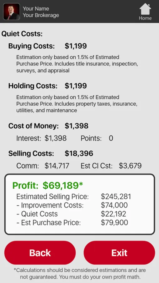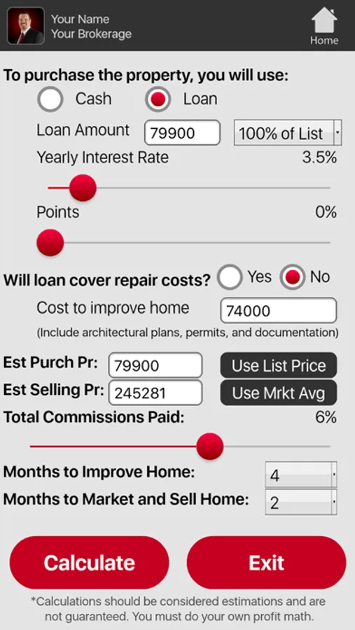 CALCULATE PROFITS - The app includes a profit calculator so that you can quickly estimate how much money you could make if you flip or rent a property. Calculate profits for a flip, and for rentals, you can calculate yearly profits, total accumulated profits, cash on cash returns, and equity over time.