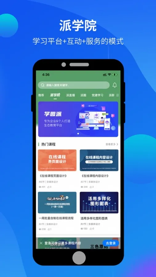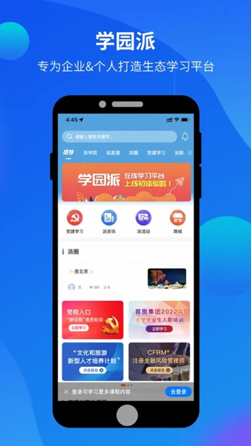 学园派APP是一款定位于生活服务业从业人群的学习交流平台,致力于服务业品质提升、从业者职业发展、塑造中国服务品牌。是集寓教于乐于一体的互动型线上学习软件,拥有完善的教学服务体系,在线教育包括线上线下培训、学历提升、职业资格考证,以及党建宣传、党建学习和人才市场,同时还有相关行业咨询、直播互动、派圈经验交流等诸多内容。来派圈不寂寞,提升自我,打造完美服务人生。