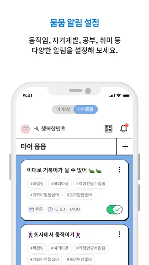 움직임, 자기계발, 공부, 취미 등 다양한 알림을 설정해 보세요.