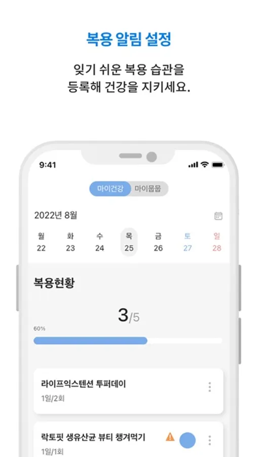 매일 먹어야 하는 영양제, 알림 설정하고 복용 습관 잊지마세요.