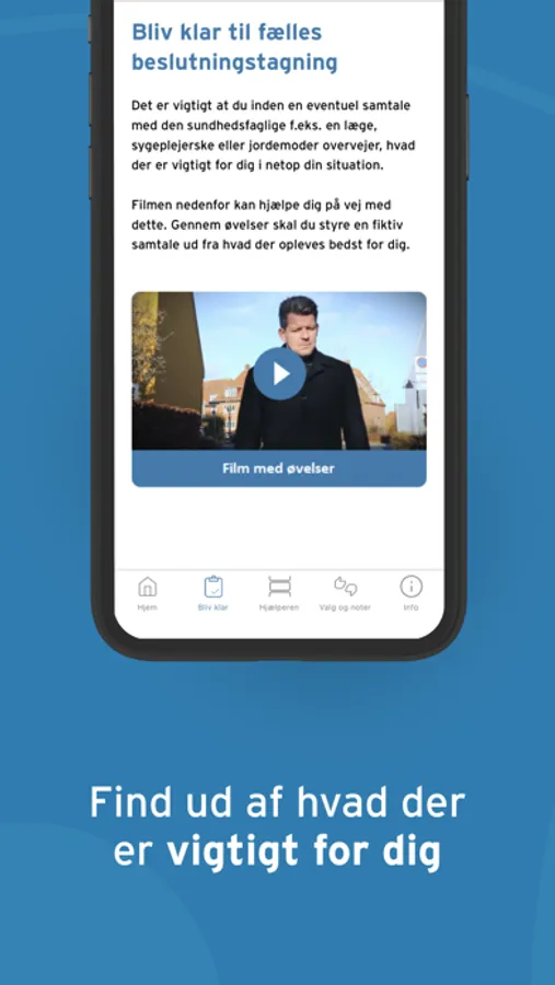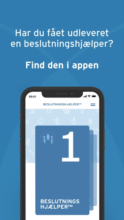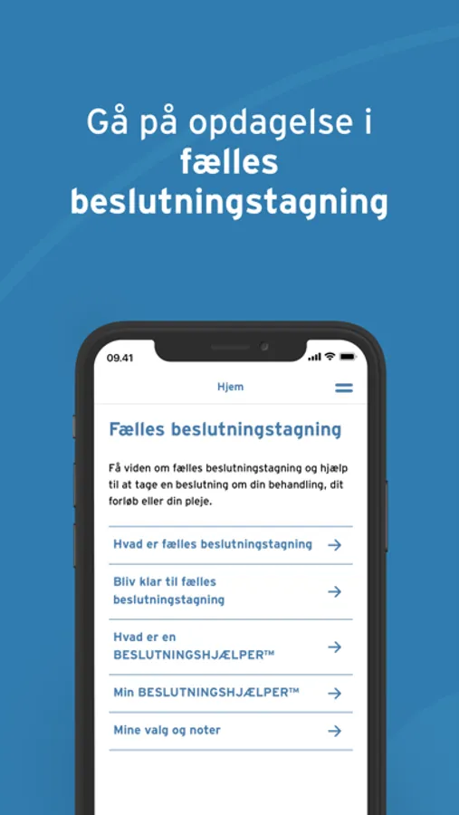 Som patient er du ekspert i eget liv. Den sundhedsfaglige, f.eks. lægen, sygeplejersken eller jordemoderen, er ekspert i diagnoser og behandlinger. Derfor er valget om f.eks. den rette behandling, forløb eller pleje, en beslutning du og den sundhedsfaglige i fællesskabfinder frem til. Det sker gennem dialog, hvor I deler viden om muligheder og hvad der er vigtigt for dig i dit liv. Denne app er udviklet til at understøtte samarbejdet mellem den sundhedsfaglige og patient. Du vil som patient blive guidet til at gøre dig overvejelser om, hvad der er vigtigt for dig i din nuværende situation.I nogle tilfælde er der udviklet et konkret beslutningsstøtteværktøj – BESLUTNINGSHJÆLPER. Disse vil også være tilgængelige på denne app.