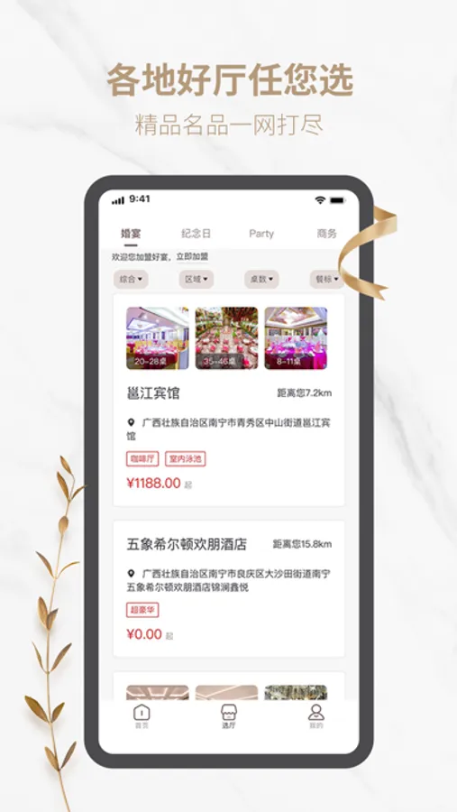 【轻松预定宴会】如婚礼,纪念日,宝宝宴,商务宴请,乔迁宴,谢师宴,派对等。可在线查看各式酒店场地,价格及档期。