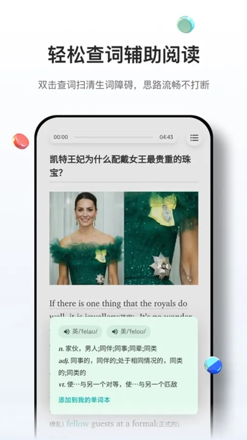 · 即指即译,单词双击就能查释义,更有发音收录助力口语提高