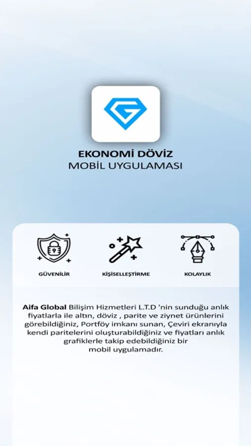 Aifa Global Bilişim Hizmetleri L.T.D 'nin sunduğu anlık fiyatlarla ile altın, döviz , parite ve ziynet ürünlerini görebildiğiniz , Portföy imkanı sunan, Çeviri ekranıyla kendi paritelerini oluşturabildiğiniz ve fiyatları anlık grafiklerle takip edebildiğiniz bir mobil uygulamadır.