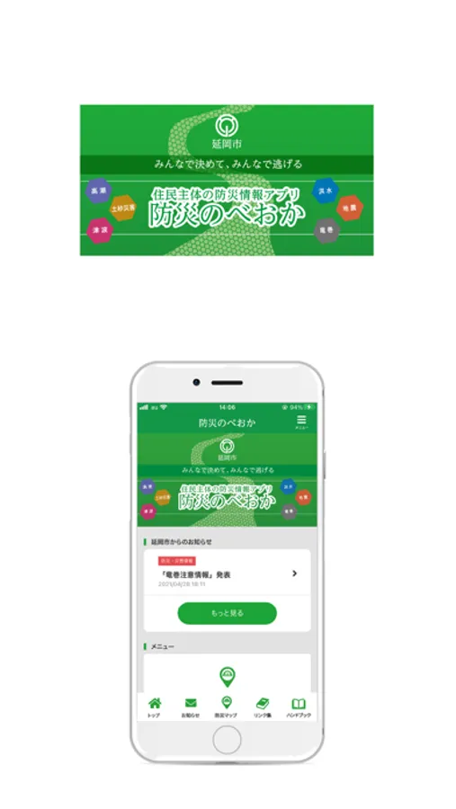 「防災のべおか」は、災害時に、延岡市民の皆様がより確実に、よりわかりやすく情報を入手し、「自分の命を守るため、自らの判断による行動」の実践を支援するために作成した、延岡市公式の防災アプリです。
