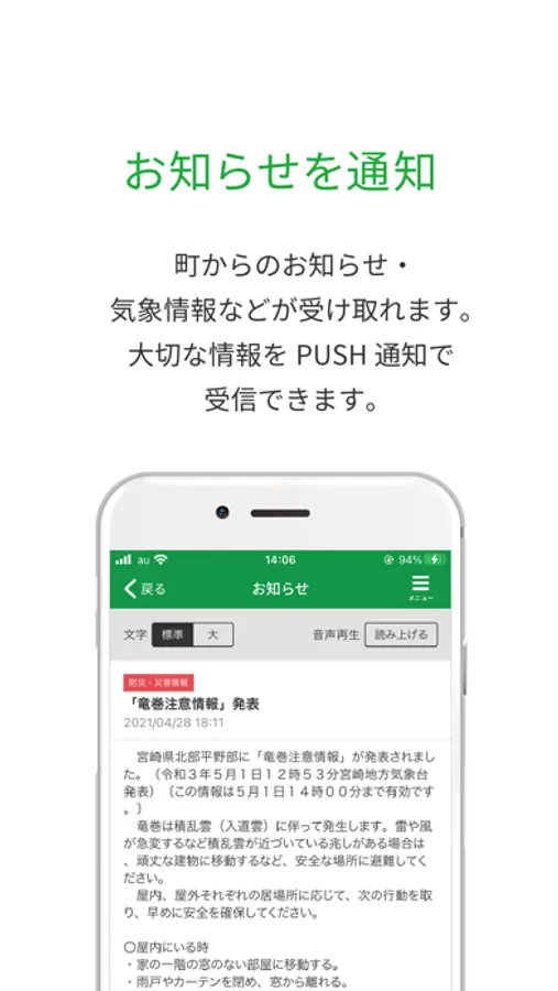 市が配信する避難情報や防災に関する情報等をプッシュ通知で受け取ることができ、文字と音声で確認することができます。
