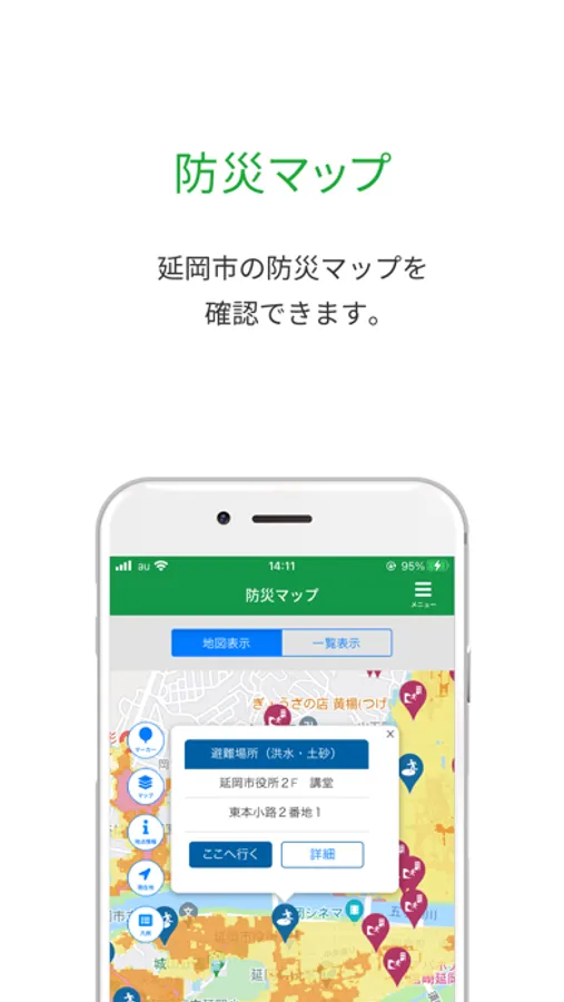 地図上で、現在地から避難場所までの距離や移動時間を調べることができます。また、避難場所の混雑状況も確認することができます。