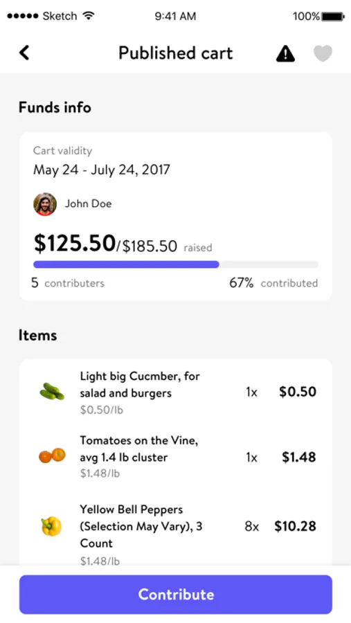 Now, the GForward app does all the work, locating your local participating grocer closest to your zip code. Your grocery list is then generated and ready for contributors to review and contribute payment for some or all of the grocery items.