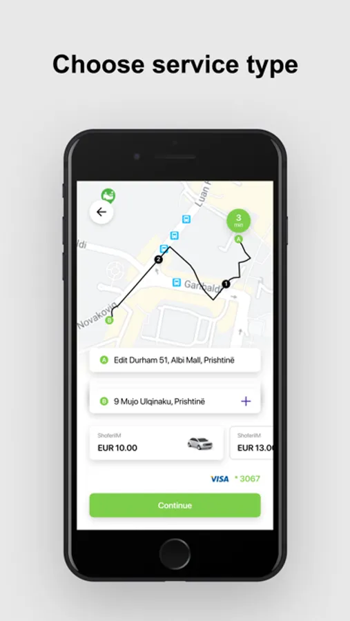 2. Indicate your current pickup point and desired destination in Pristina, Kosovo. The app will let you know once your driver has arrived when a new booking is created.