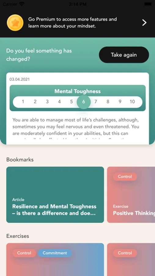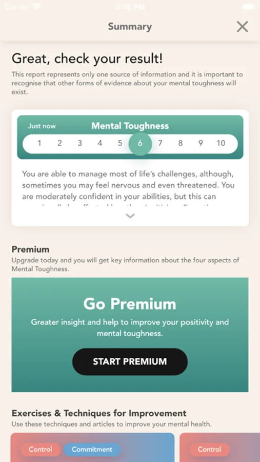The free version contains 15 questions designed to provide the user with an overall Mental Toughness score. There are also a number of exercises and articles designed to help improve Mental Toughness. The premium version contains a more detailed assessment questionnaire and provides an analysis of the user’s Mental Toughness across the key elements of Control, Commitment, Challenge and Confidence. It also contains further tools, exercises and relevant articles.