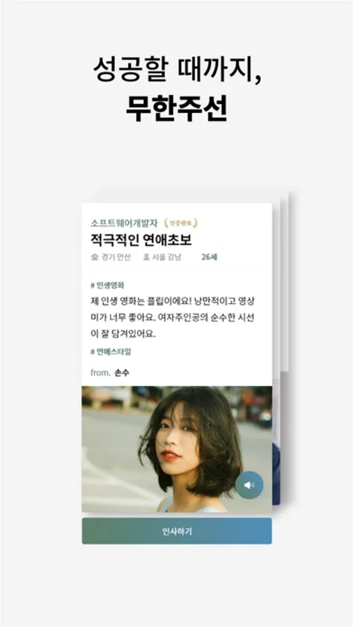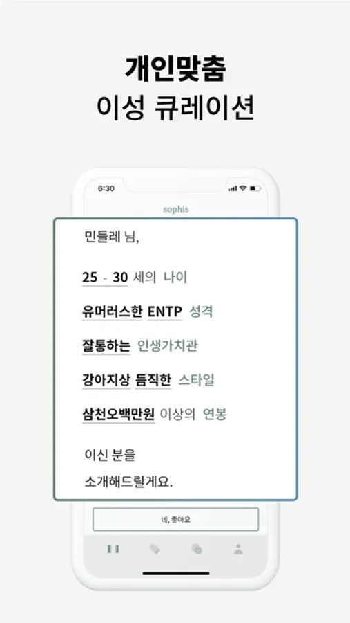 원하는 이상형 정보를 입력하세요. 무분별하게 소개하지 않아요. 진중한 만남이 될 수 있도록 데이터에 근거하여 한 사람 한 사람을 신중하게 큐레이션해드려요.